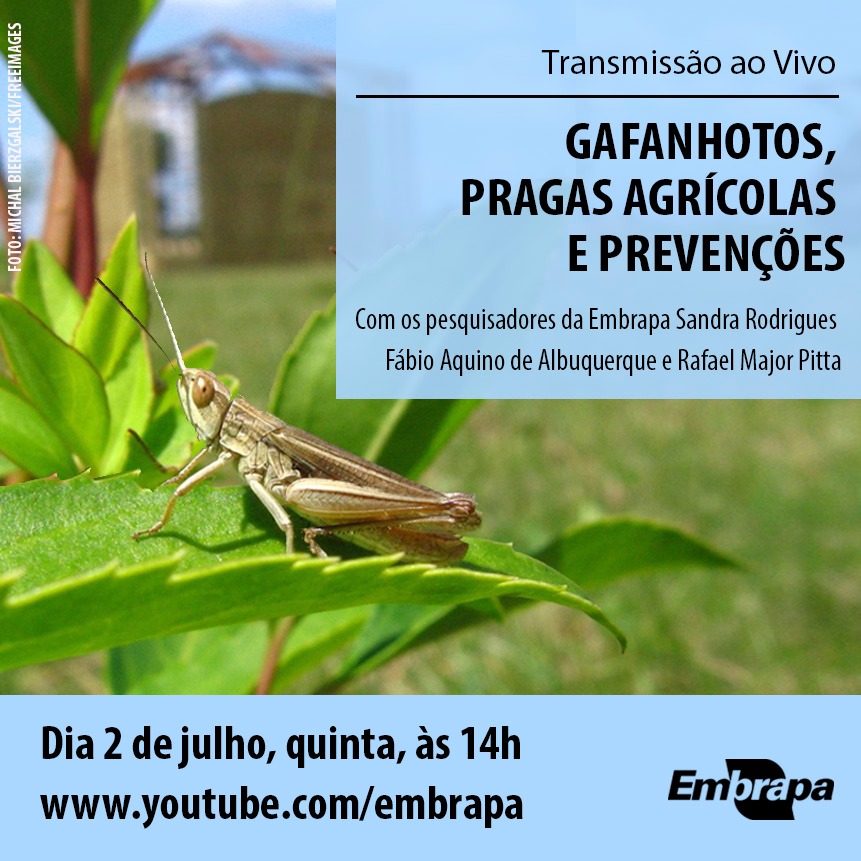 Pesquisadores de três Unidades da Embrapa abordam os danos causados pelas pragas à produção agrícola nacional. O tema ganhou ampla repercussão a partir da ameaça de invasão de uma nuvem de gafanhotos em solo brasileiro. Participam do seminário virtual os pesquisadores Sandra Rodrigues (Embrapa Agroindústria Tropical), Fábio Aquino de Albuquerque (Embrapa Algodão) e Rafael Major Pitta (Embrapa Agrossilvipastoril). A transmissão será realizada nesta quinta, dia 2, às 14h, no Canal da Embrapa no Youtube: www.youtube.com/embrapa