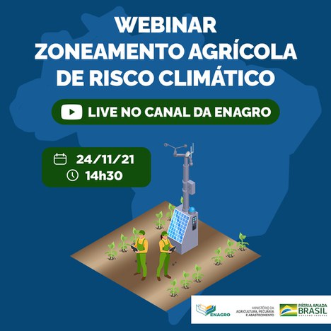 O Ministério da Agricultura, Pecuária e Abastecimento, através do canal do youtube da ENAGRO, promove no dia 24 de novembro às 14h30, o primeiro webinar do Programa Nacional de Zoneamento Agrícola de Risco Climático (Zarc), que tem como objetivo disseminar as informações sobre o Zarc apresentando a forma como o estudo é realizado, desde a coleta de dados climatológicos, metodologia/modelagem agrícola, validação externa dos resultados. Será apresentado também os meios de divulgação dos dados: aplicativo Zarc Plantio Certo e o painel de indicação de riscos, além dos normativos relacionados ao Zarc e aplicação nos programas e políticas públicas.