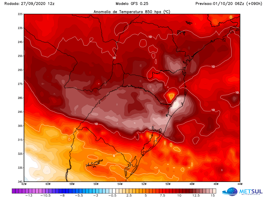 Será um evento extraordinário de calor, alerta a MetSul. As anomalias de temperatura que são mostradas pelos modelos numéricos são absolutamente incomuns com desvios imensos. As simulações computadorizadas chegam a projetar temperatura no nível de pressão de 850 hPa (1.500 metros de altitude) entre 15ºC e 20ºC acima do normal no Centro-Sul do Brasil. Já a temperatura em 850 hPa projetada para a metade da semana em alguns estados do Centro-Oeste, do Sudeste e do Sul fica perto de 30ºC a 1.500 metros de altitude, o que somente se observa em ondas excepcionais de calor como que se registram em áreas acostumadas a calor muito extremo como o Cuyo na Argentina, Califórnia e Austrália.