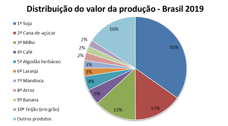 No ranking das 10 culturas que mais geram valor à produção, houve duas alterações em 2019. A laranja superou a mandioca, passando a ocupar a sexta posição em valor de produção, e o feijão voltou a figurar na 10ª posição. A soja, mesmo com retração de 1,8% no ano, totalizou R$ 125,6 bilhões, se mantendo na primeira posição. Na sequência, aparecem a cana-de-açúcar (R$ 54,7 bilhões), com alta de 5,3%, e o milho (R$ 47,6 bilhões), com expressivo aumento de 26,3%.