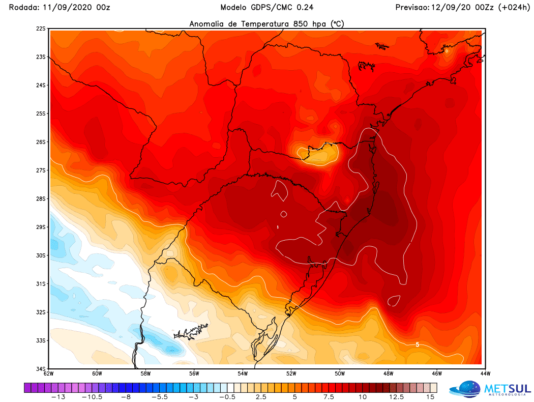 A alimentação de ar quente será expressiva com temperatura muito alta no Noroeste e no Norte do Estado, de 20ºC a 23ºC no nível de 850 hPa (1.500 metros de altitude), o que vai gerar condições propícias para convecção significativa entre a tarde e a noite de hoje em pontos isolados. Há risco na região metropolitana de Porto Alegre, entretanto se ocorrer deve mais localizado que nos recentes eventos de instabilidade.